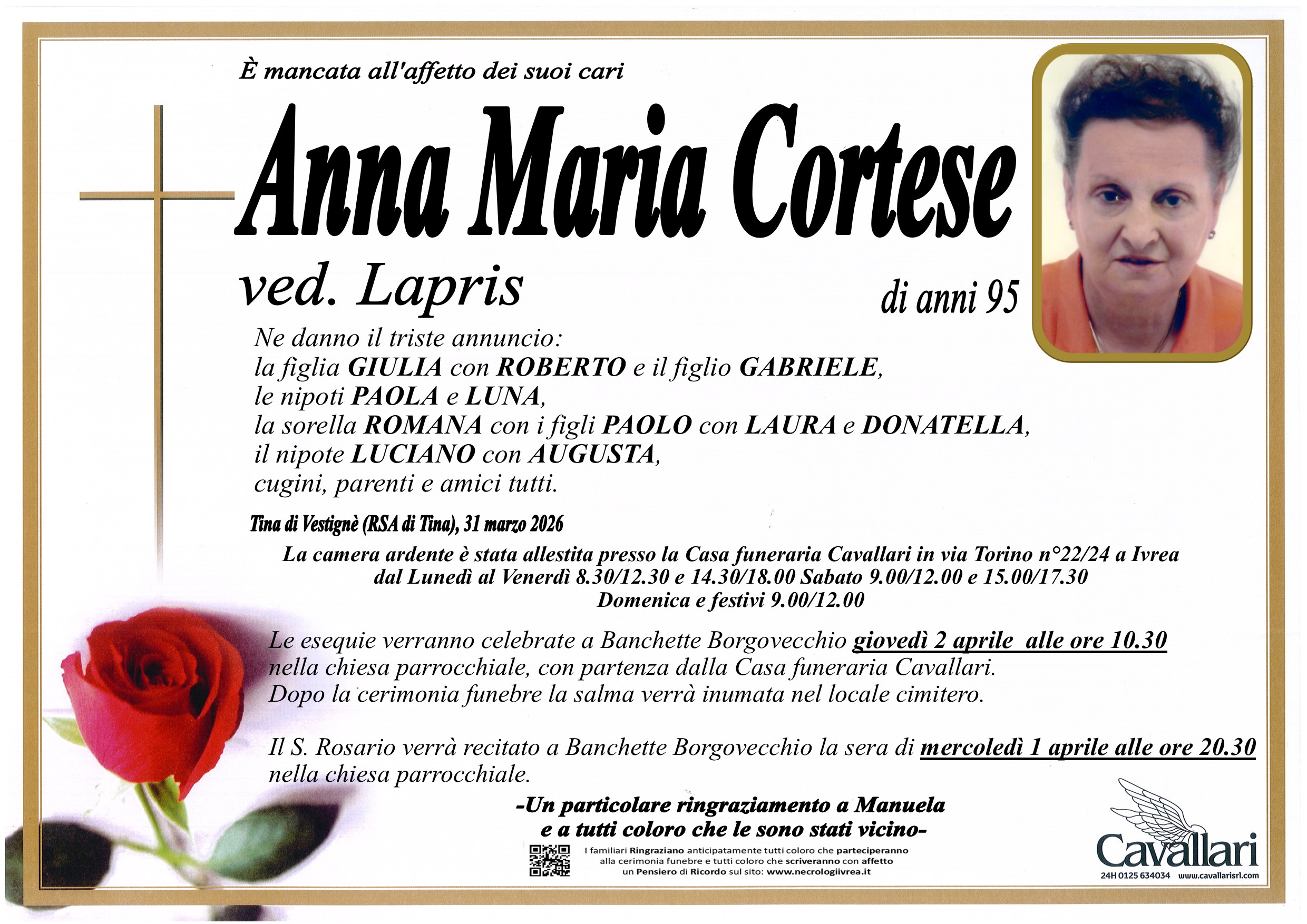 I familiari ringraziano anticipatamente tutti coloro che parteciperanno alla cerimonia funebre