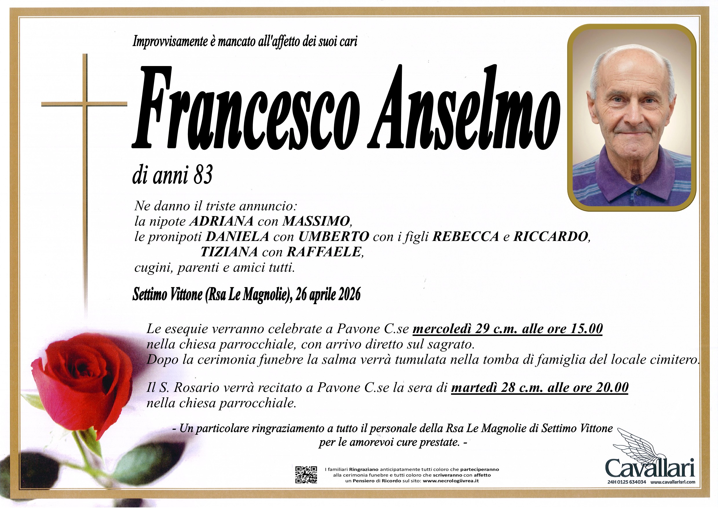 I familiari ringraziano anticipatamente tutti coloro che parteciperanno alla cerimonia funebre