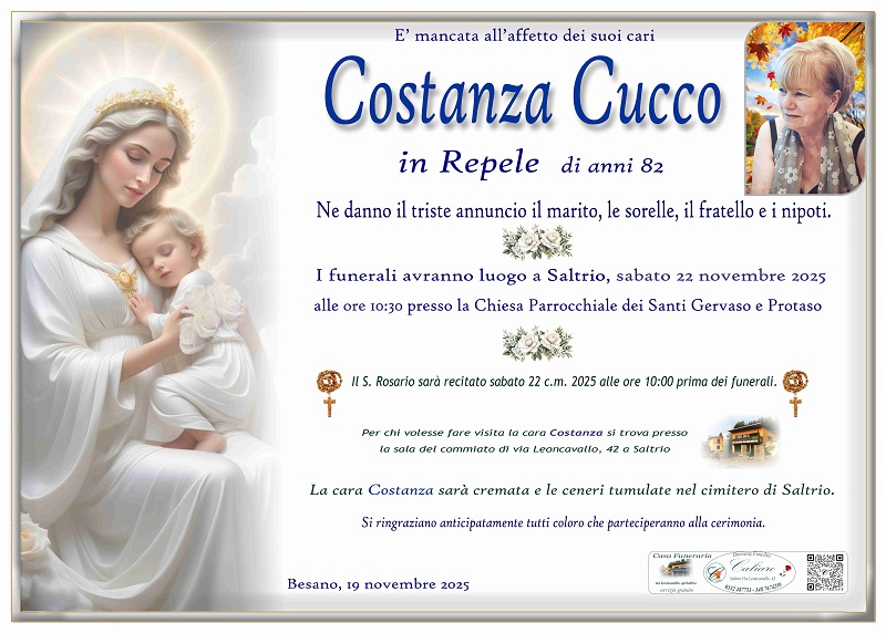 Il S. Rosario sarà recitato sabato 22 novembre alle ore 10:00 prima dei funerali.