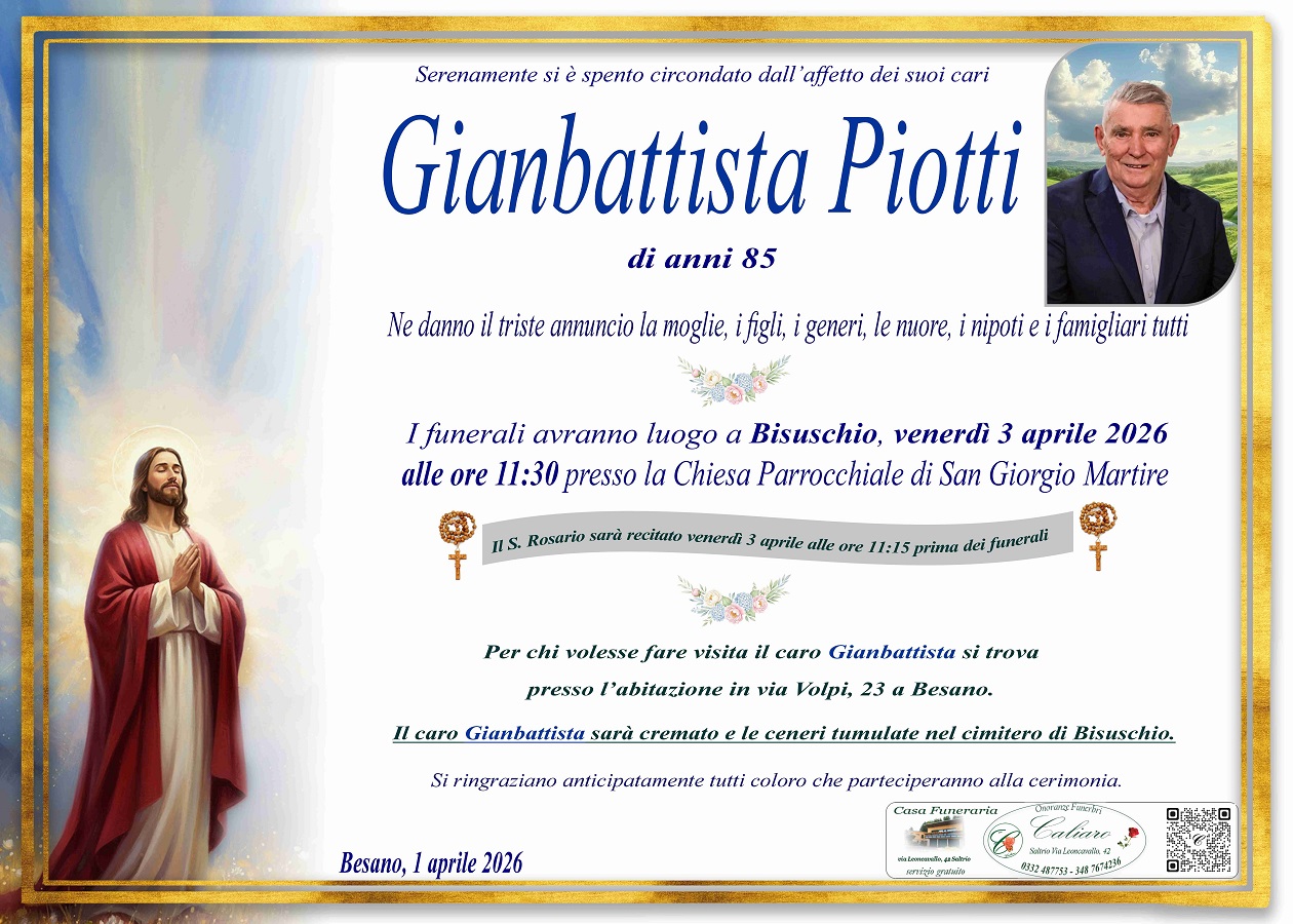 Il caro Gianbattista sarà cremato e le ceneri tumulate nel cimitero di Bisuschio.