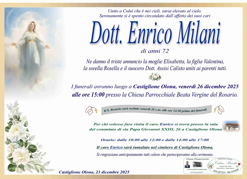 I funerali avranno luogo a Castiglione Olona, venerdì 26 dicembre 2025
