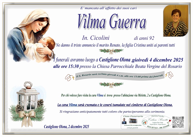 La cara Vilma sarà cremata e le ceneri tumulate nel cimitero di Castiglione Olona.