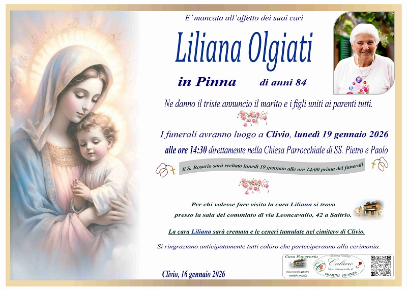 La cara Liliana sarà cremata e le ceneri tumulate nel cimitero di Clivio.