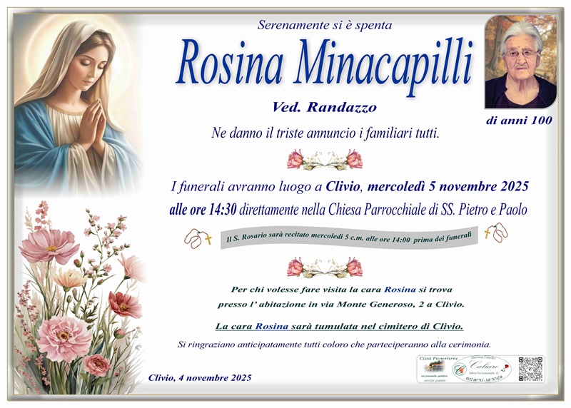 Il S. Rosario sarà recitato mercoledì 5 novembre alle ore 14:00 prima dei funerali.