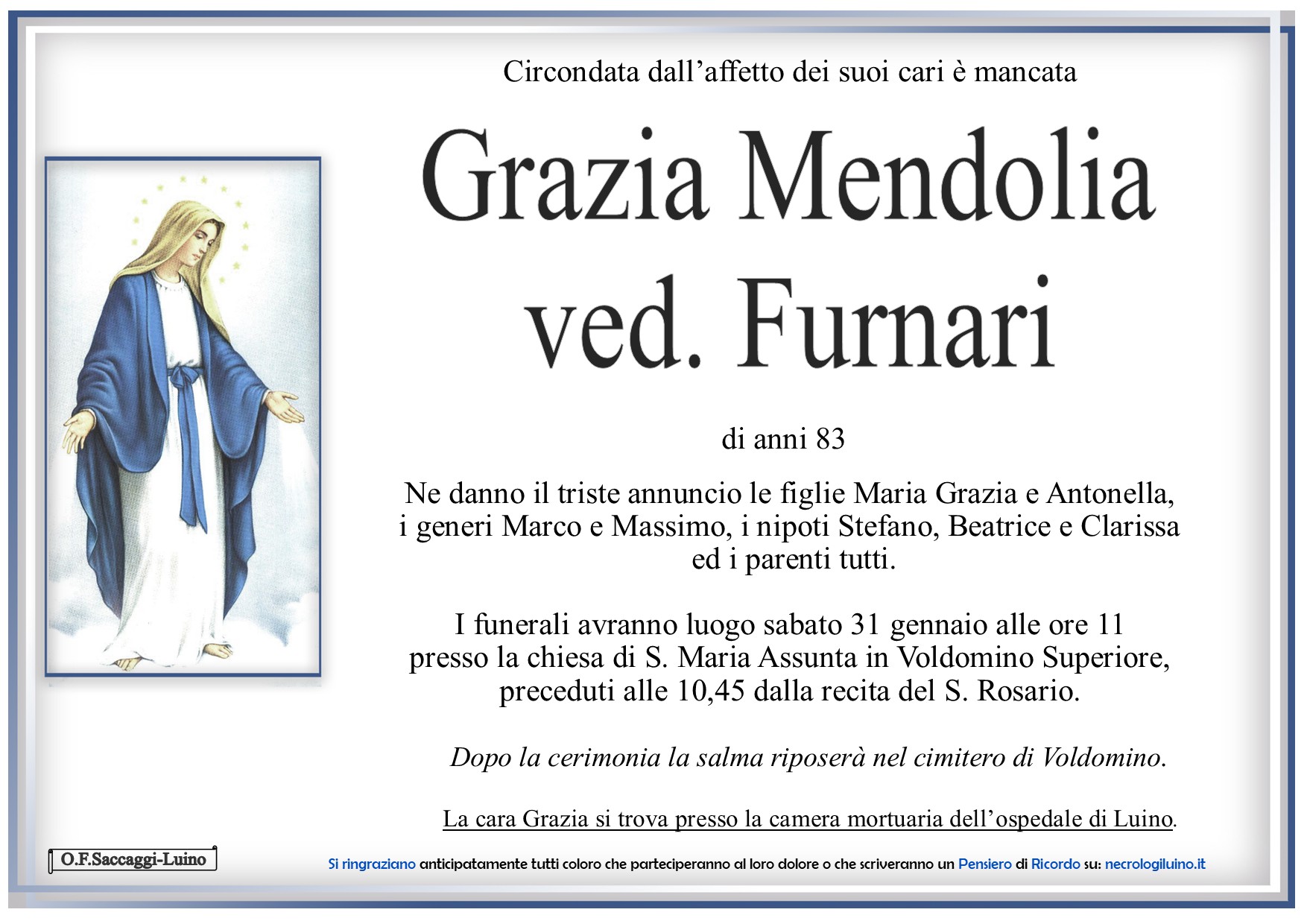 I familiari ringraziano anticipatamente tutti coloro che parteciperanno alla cerimonia funebre