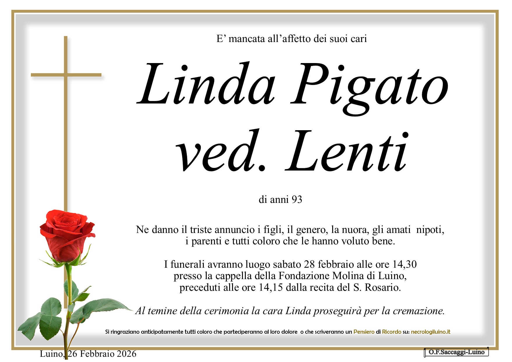 Quanti anni sono passati ma è sempre vivo il ricordo della sig Linda e il marito il sig Lenti vicini di casa della mia famiglia Virginia e Carlo massobrio noi piccolini ora anche mia madre morta da poco è lassù con loro assieme a papà le mie più sincere condoglianze in particolare a Loredana ricordo ragazzina con affetto profondo e sincero