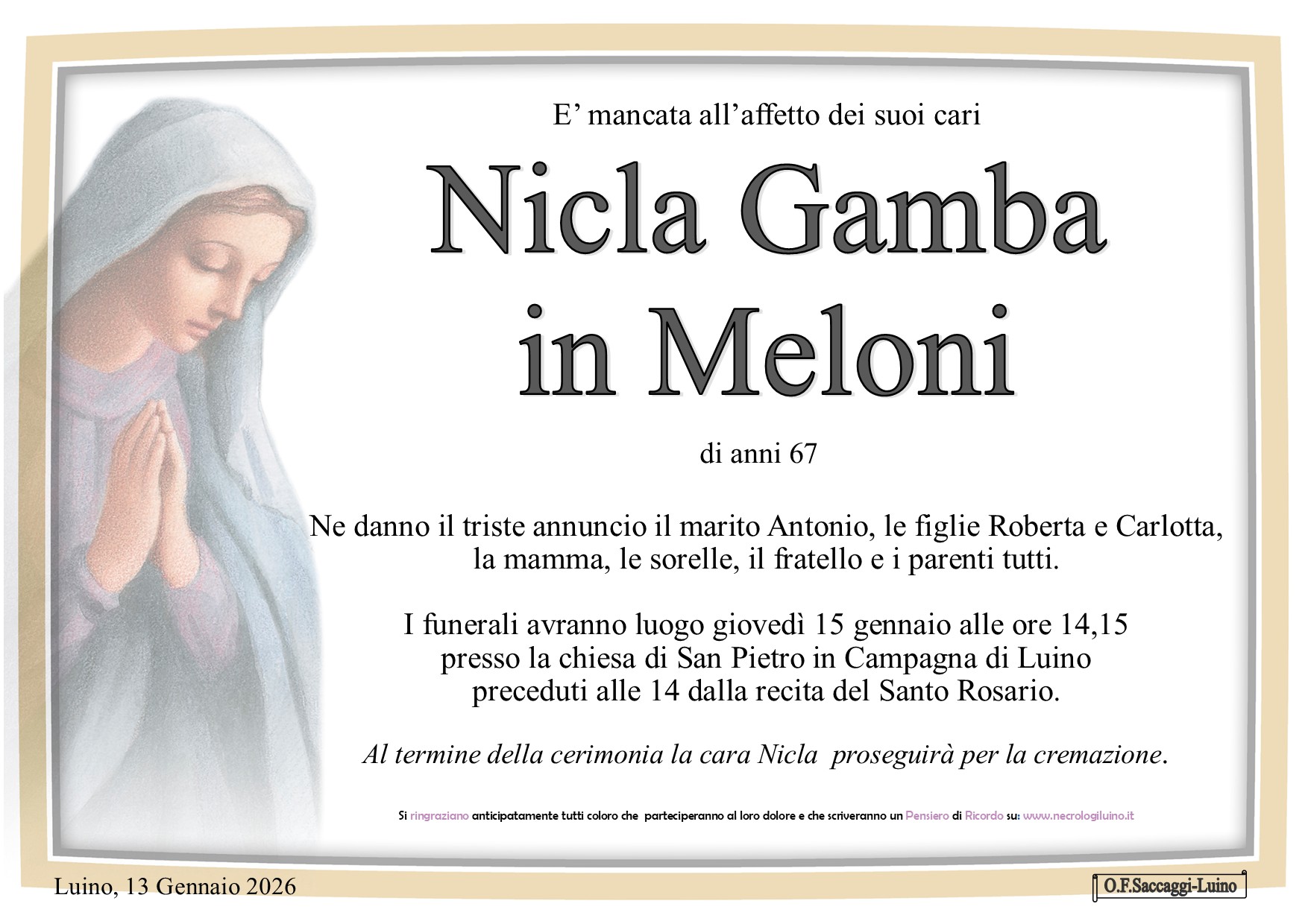I familiari ringraziano anticipatamente tutti coloro che parteciperanno alla cerimonia funebre