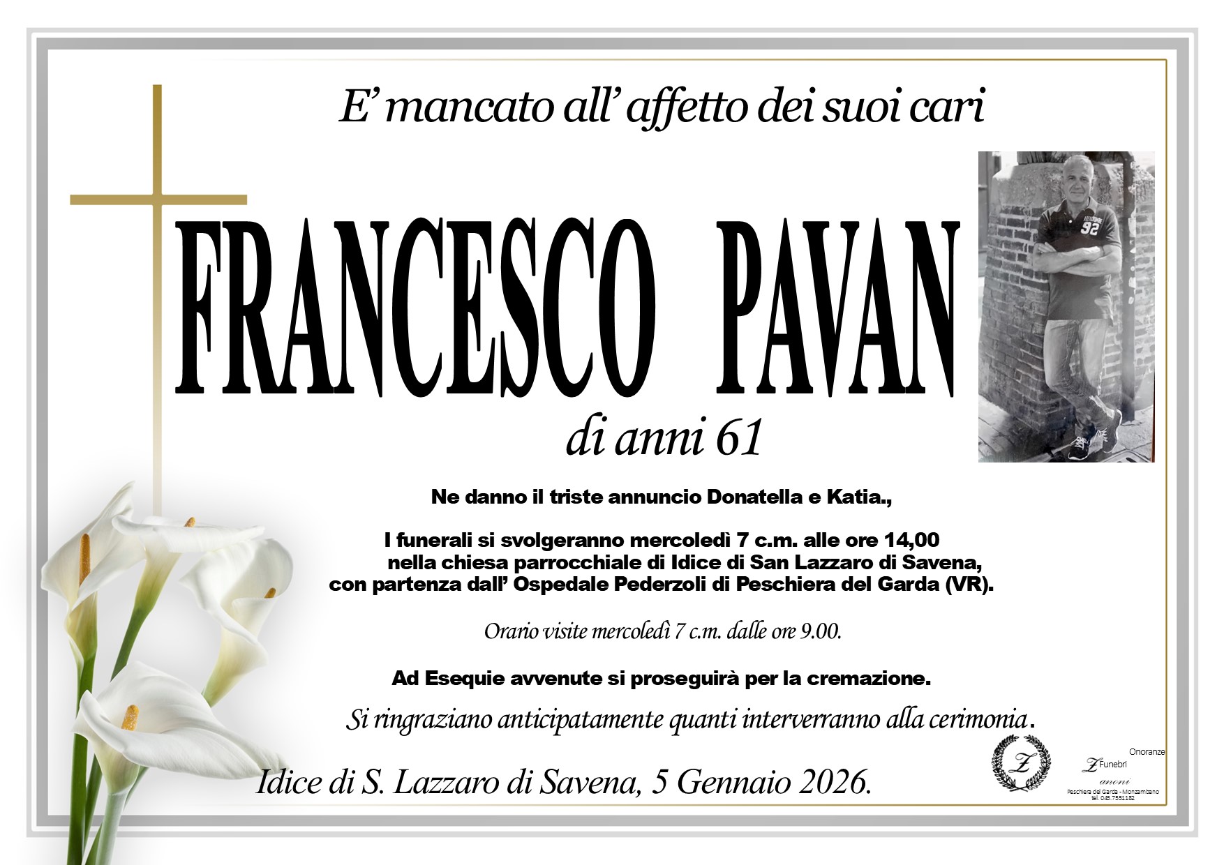I familiari ringraziano anticipatamente tutti coloro che parteciperanno alla cerimonia funebre