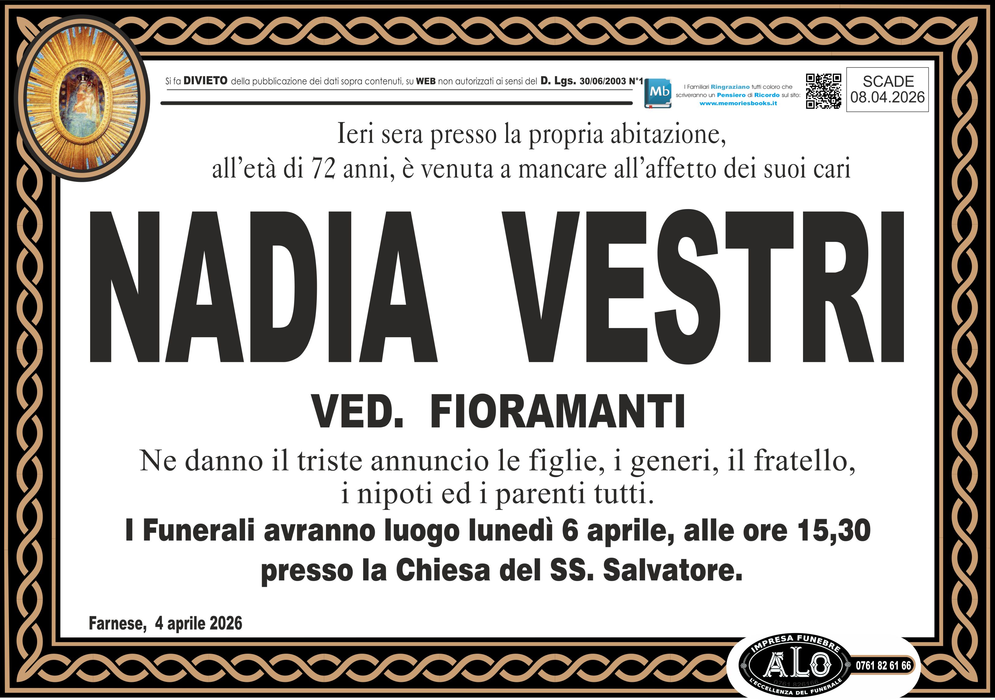 I Funerali avranno luogo lunedì 6 aprile, alle ore 15,30
