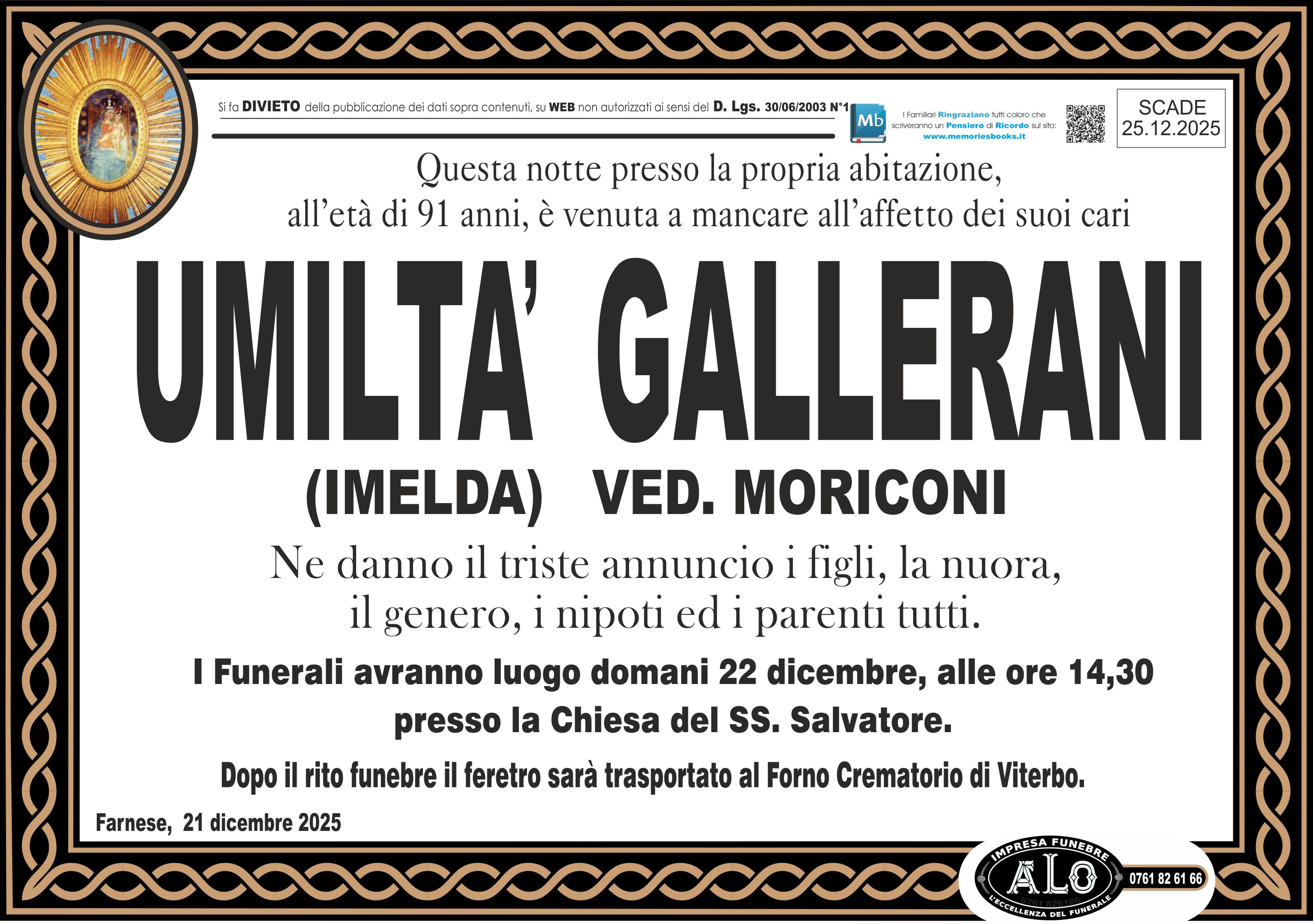Dopo il rito funebre il feretro sarà trasportato al Forno Crematorio di Viterbo.