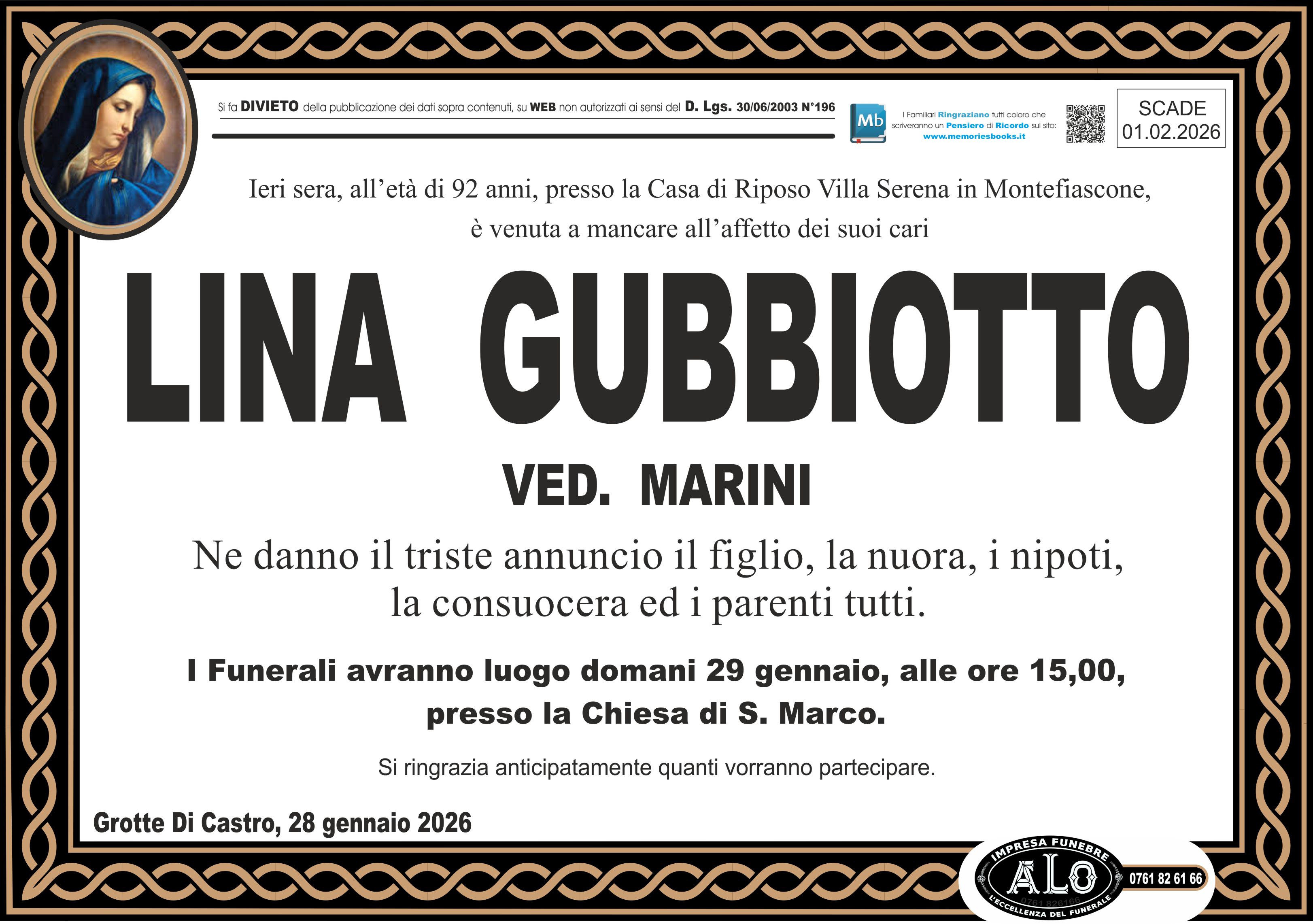 I Funerali avranno luogo domani 29 gennaio, alle ore 15,00,