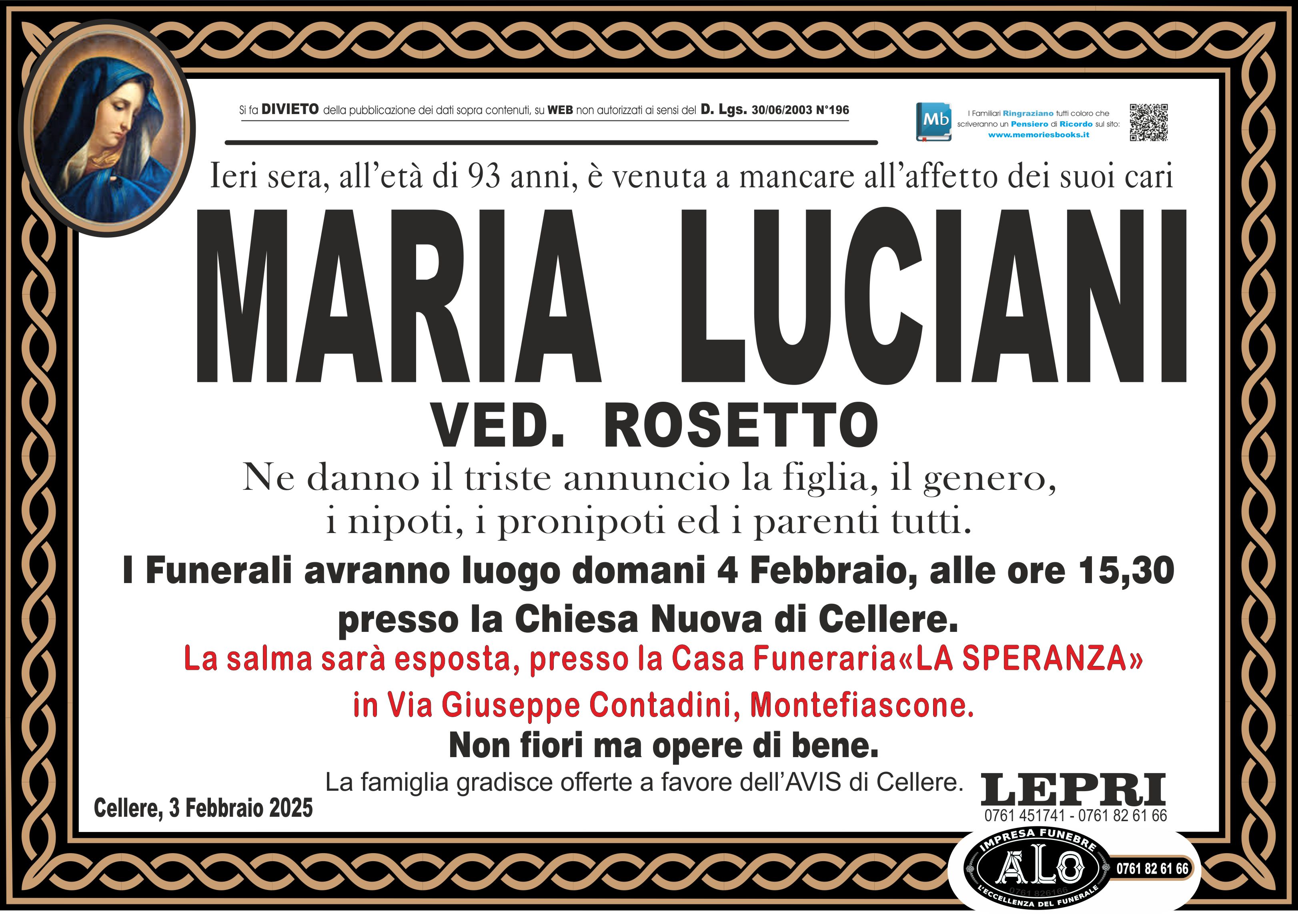 I Funerali avranno luogo domani 4 Febbraio, alle ore 15,30