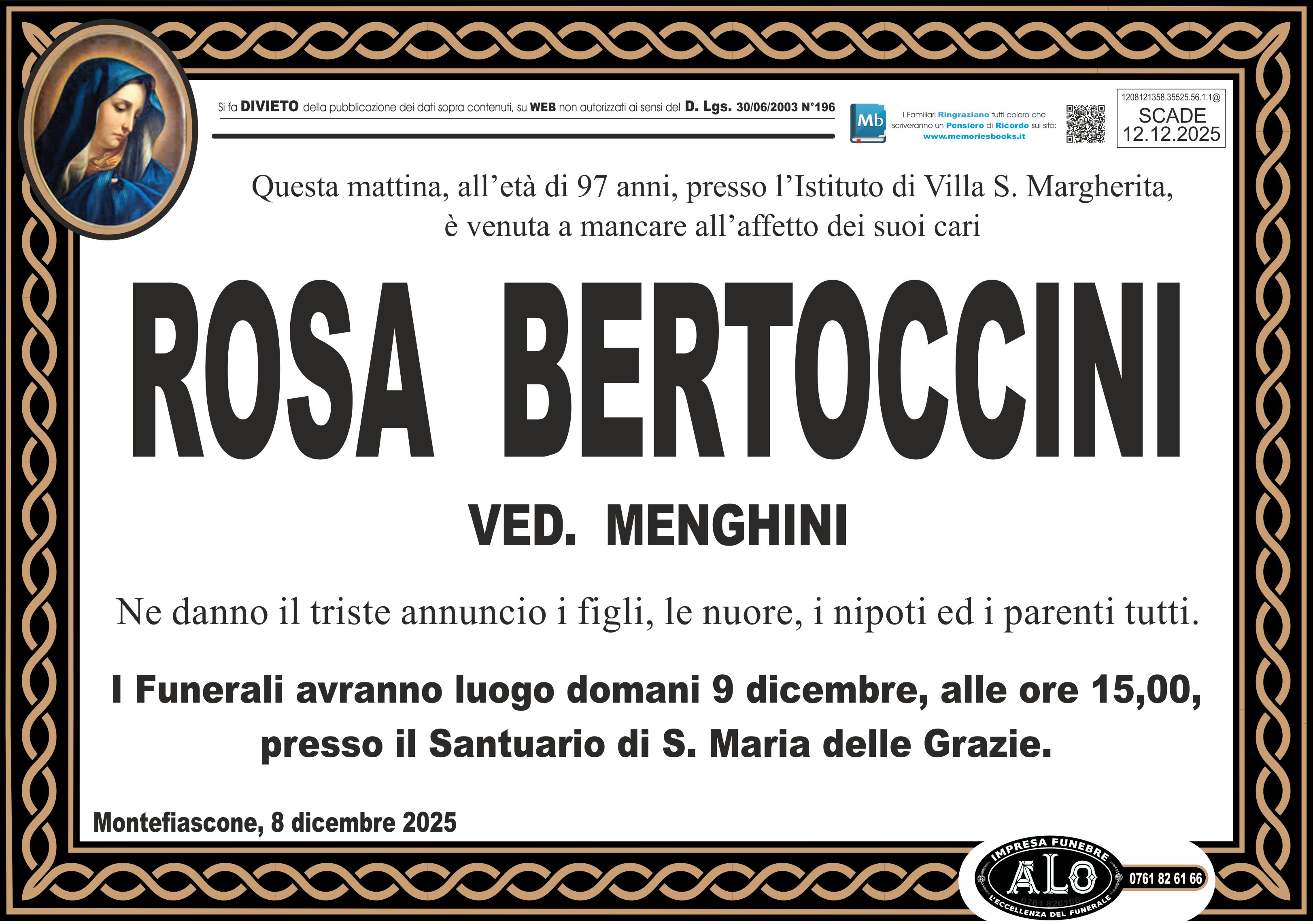 I Funerali avranno luogo domani 9 dicembre, alle ore 15,00,