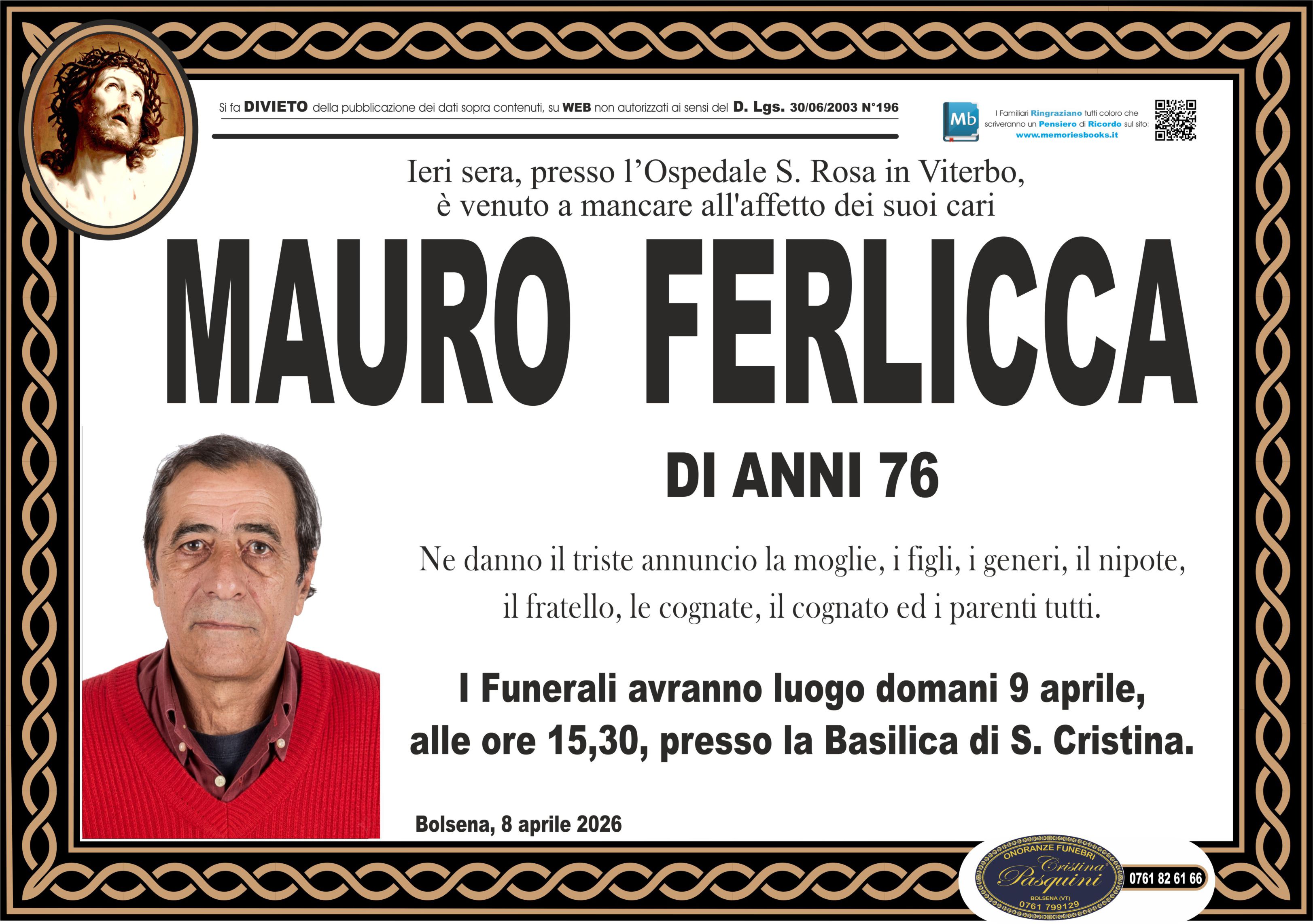 I Funerali avranno luogo domani 9 aprile,