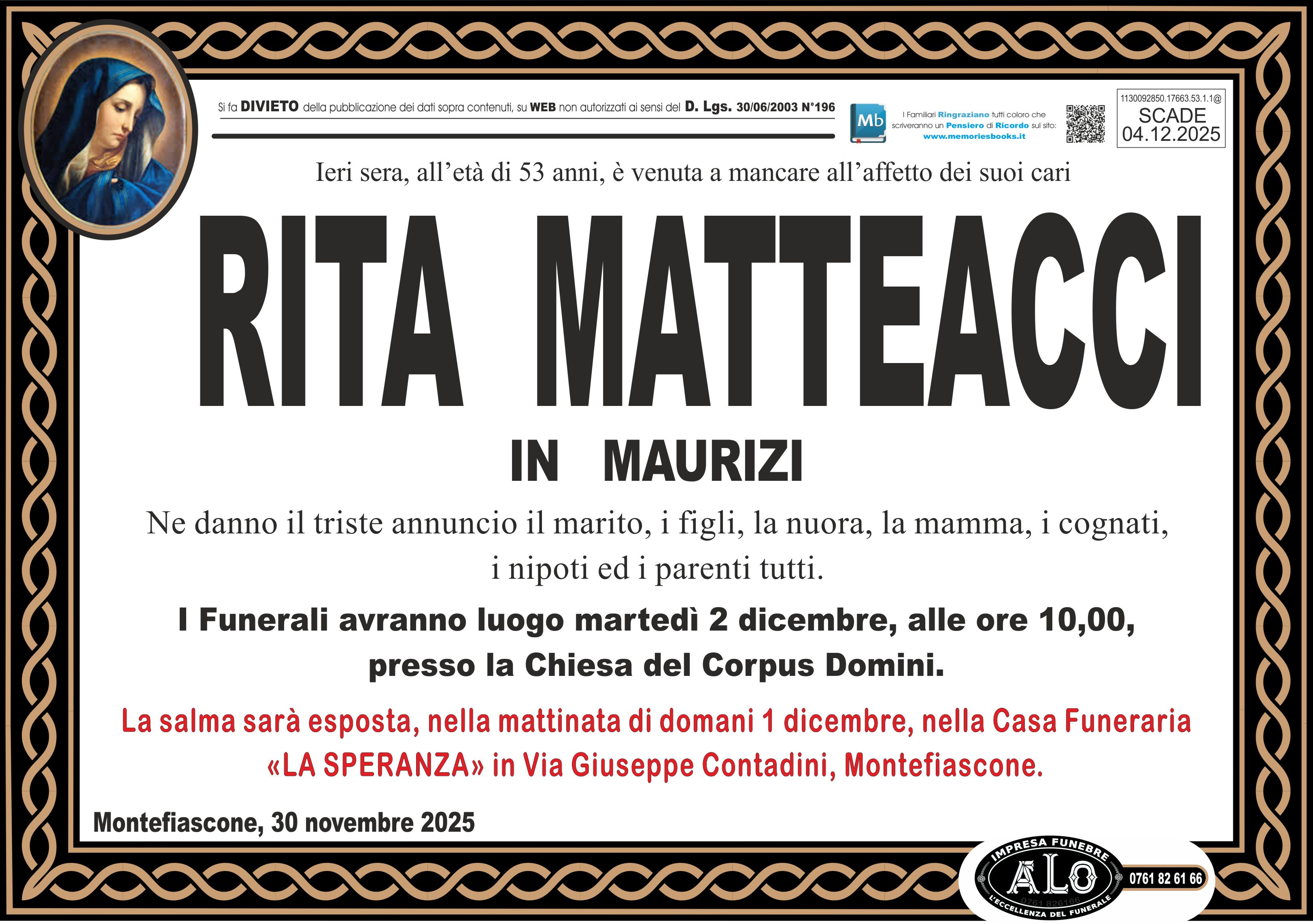 I Funerali avranno luogo martedì 2 dicembre, alle ore 10,00,